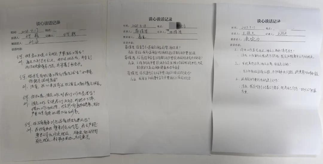 公司各部門組織開展全覆蓋式涉酒等風險隱患排查,通過“一對一”談話、“面對面”提醒等方式,深入排查重點人員、關鍵環(huán)節(jié),確保風險隱患無遺漏、無死角。